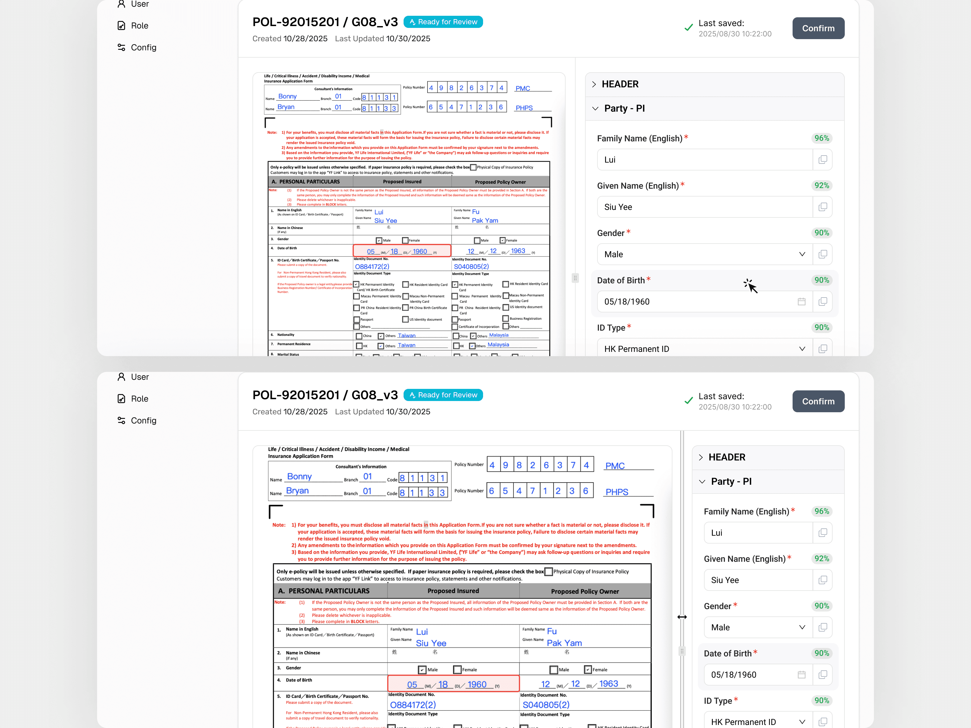 When a document is selected, the system displays a dual-pane review workspace: the original PDF on the left, and AI-extracted structured fields on the right. Clicking any field automatically positions and highlights the corresponding area on the physical form, enabling precise, one-to-one comparison without manually hunting through dense PDFs. Users can also freely drag, scroll, and zoom within either pane, allowing flexible inspection of large or complex documents.