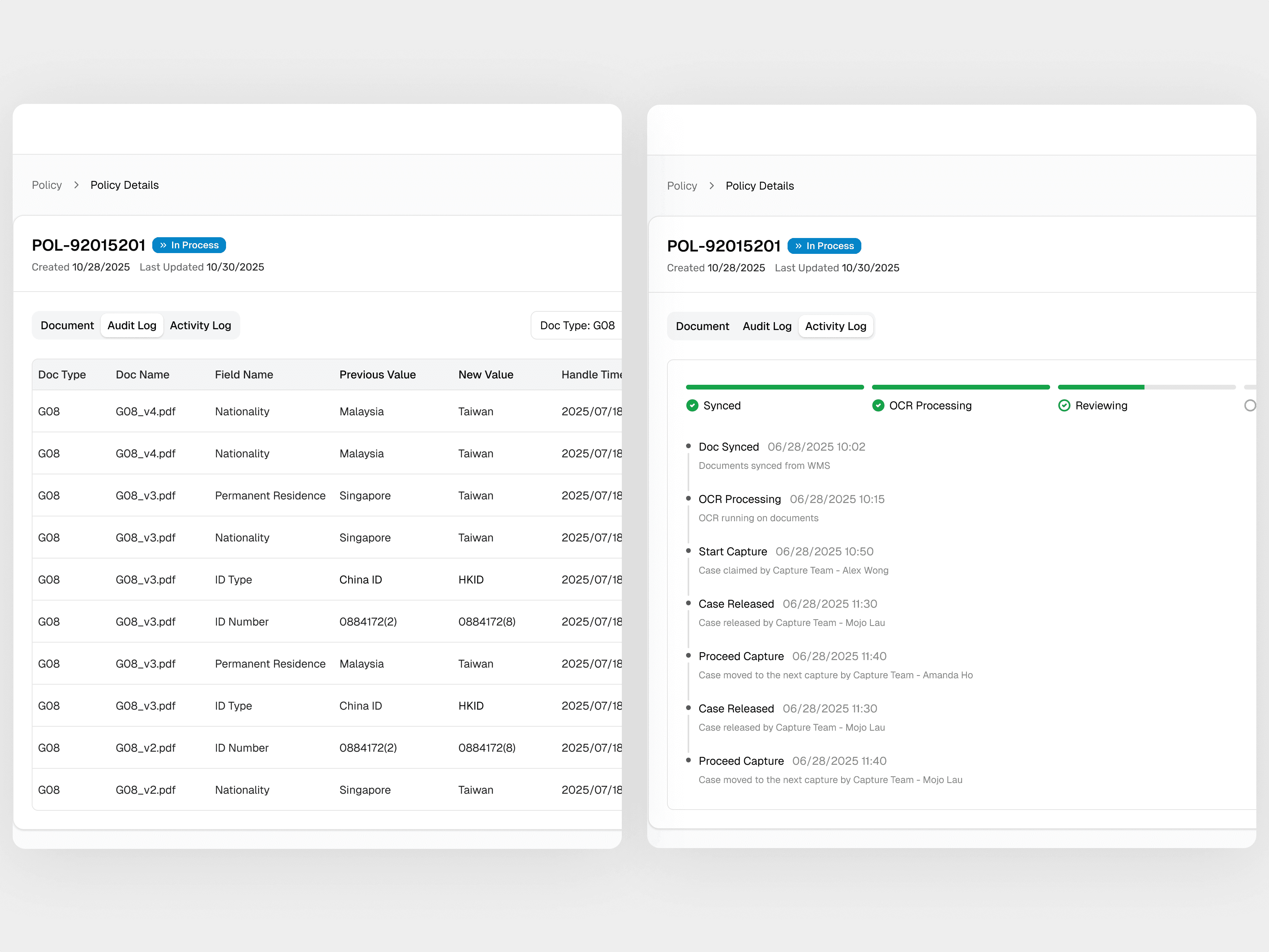 Each case maintains its own document audit log and policy activity log, capturing extraction results, edits, status changes, and submission records. This improves collaboration between internal teams and ensures that all decisions and modifications remain auditable—critical for insurance compliance and post-review processes.