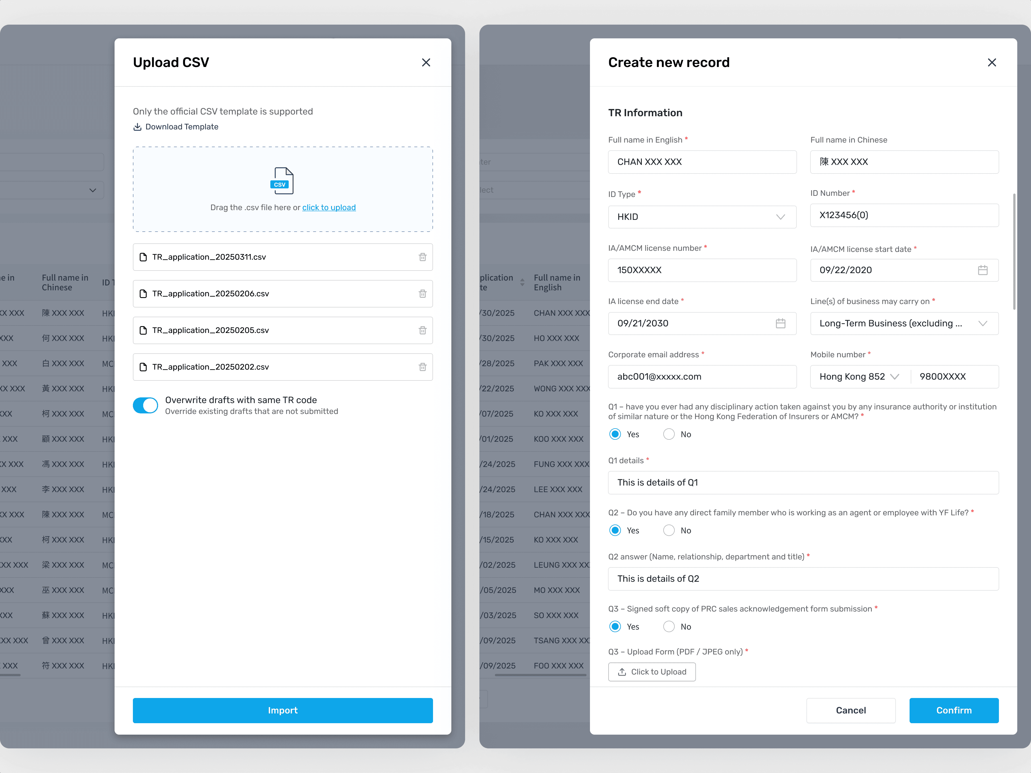 To streamline the high-frequency tasks of uploading data and creating new records, these workflows were shifted into an overlay-based interface. This enables users to complete multi-step actions without leaving the main table, reducing context switching and improving task continuity. By standardizing the input experience into a consistent, form-focused overlay, the system becomes both easier to scale and significantly more intuitive for users.