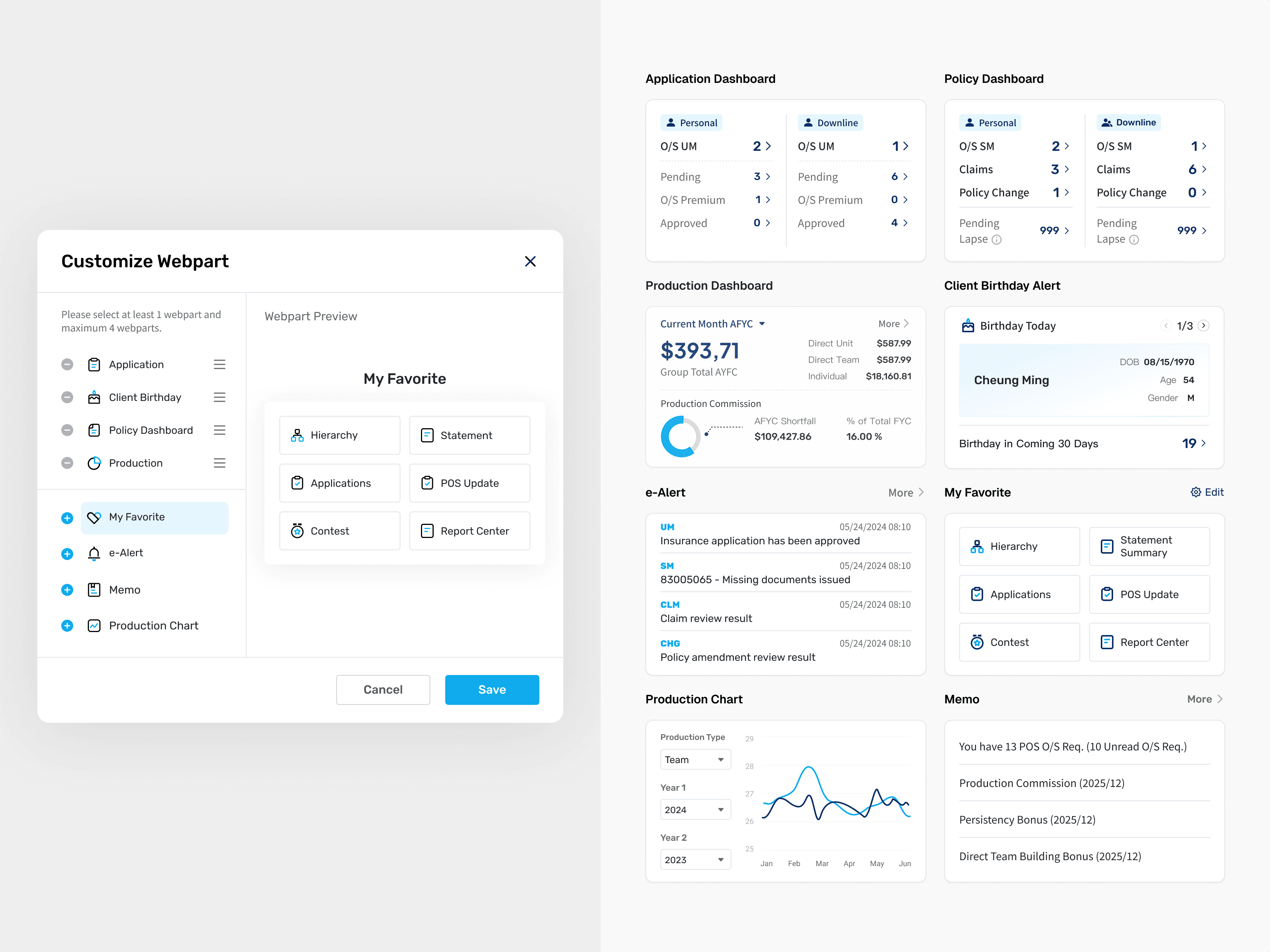 To further meet diverse user needs, we introduced a customizable Webpart framework, allowing users to freely configure their own dashboards. This enhances personalization, promotes task efficiency, and aligns with a user-centered adaptive interface approach that balances flexibility and control.