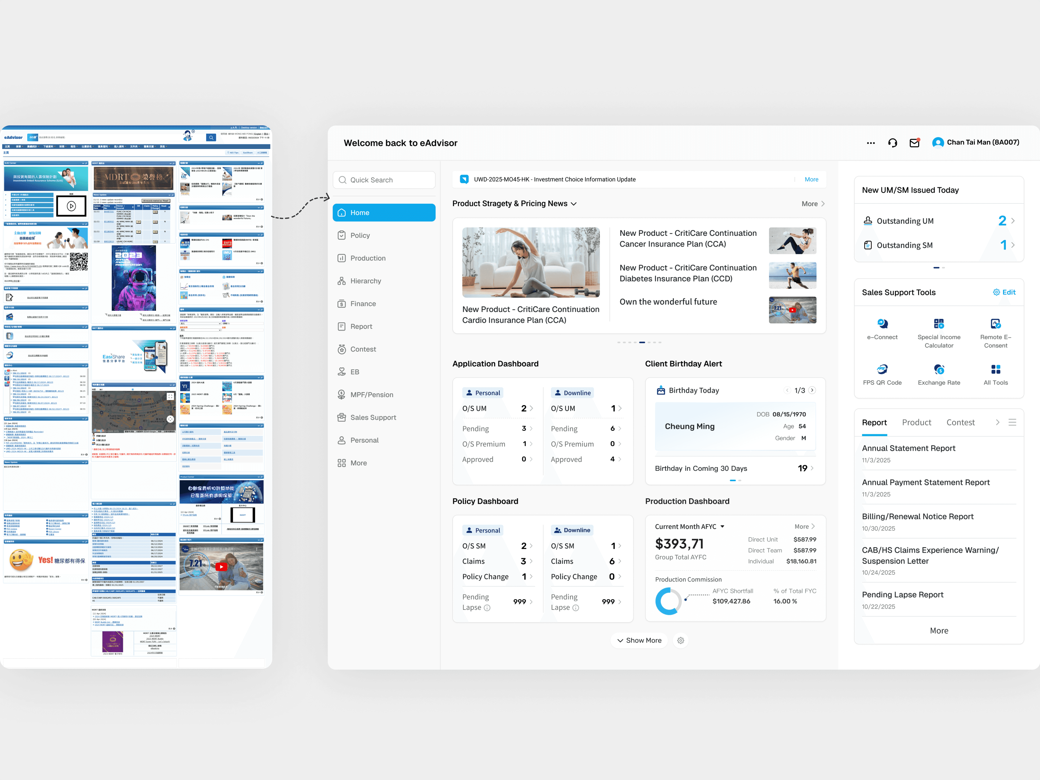 eAdvisor is an insurance inquiry platform built for advisors. This project represents a complete rebuild from the ground up, replacing a legacy system that had been in use for over 20 years, modernizing its structure, visuals, and interactions. Phase I focuses on restructuring the product architecture and revamping the homepage UI/UX, while establishing a new design system to guide future module updates.