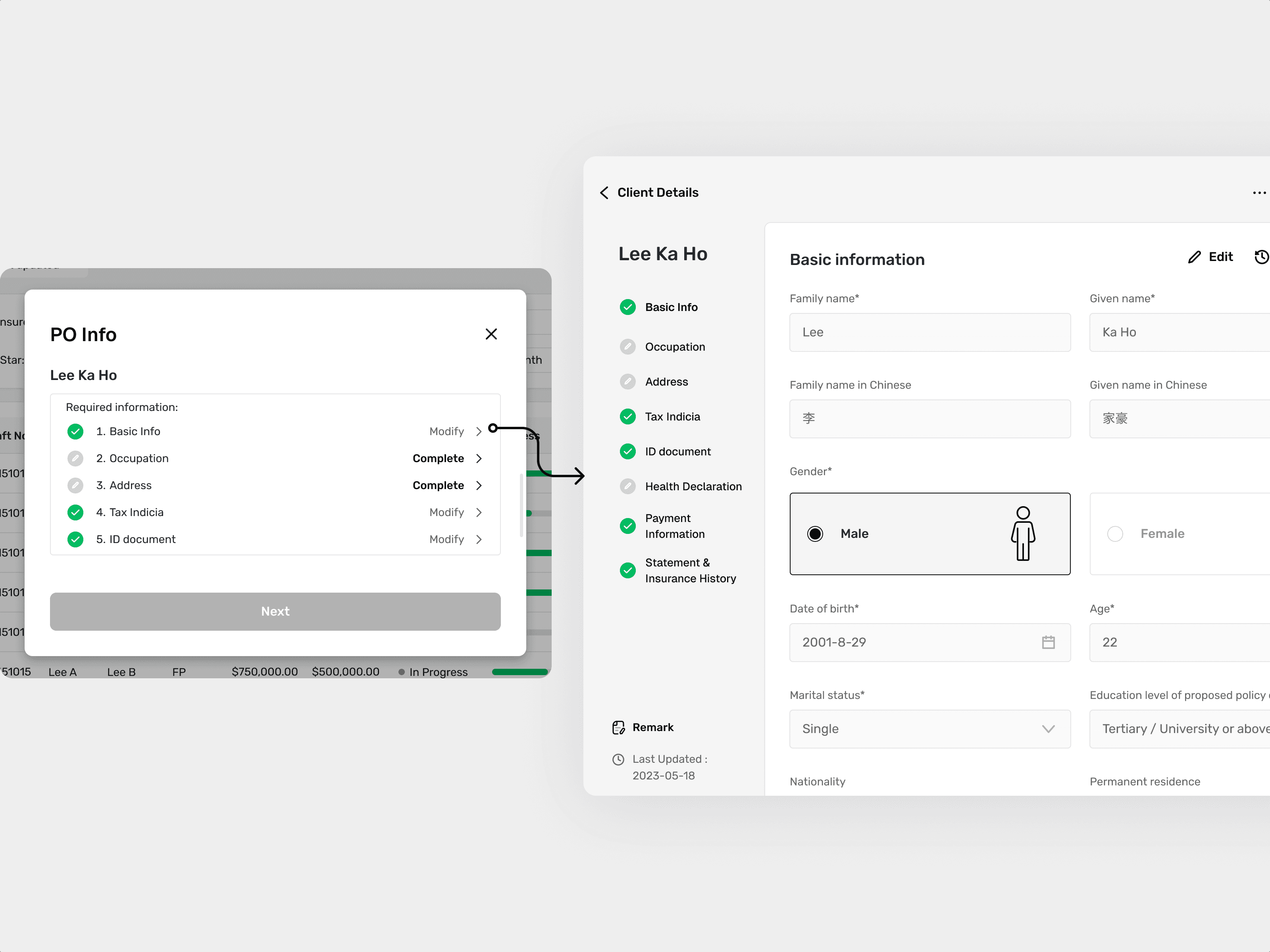 Building on this modular foundation, we then decomposed the Client Information module into sub-modules such as Basic Info, Occupation, and Tax Indicia. This allows brokers to pre-fill and manage client data independently, which can then be automatically reused in future applications.